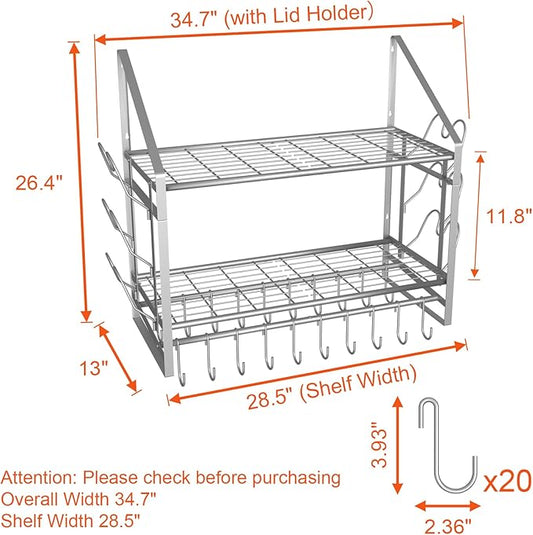 VyGrow 28 Inch Pot Rack Wall Mounted, 2 Tier Pots and Pans Organizer with 20 Hooks and 6 Pot Lid Holders, Heavy Duty Steel Pot and Pan Hanger for Kitchen Cookware Utensils Storage, Silver