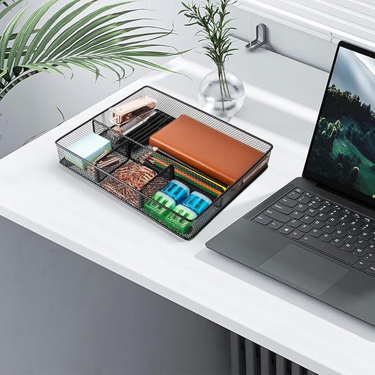 VyGrow Desk Drawer Organizer Tray, Metal Mesh Drawer Organizers Office, 4 Grid with Adjustable Compartment, Desk Organizer Tray for Home Office 12x10.6x1.9 inch Black, 2 Pack
