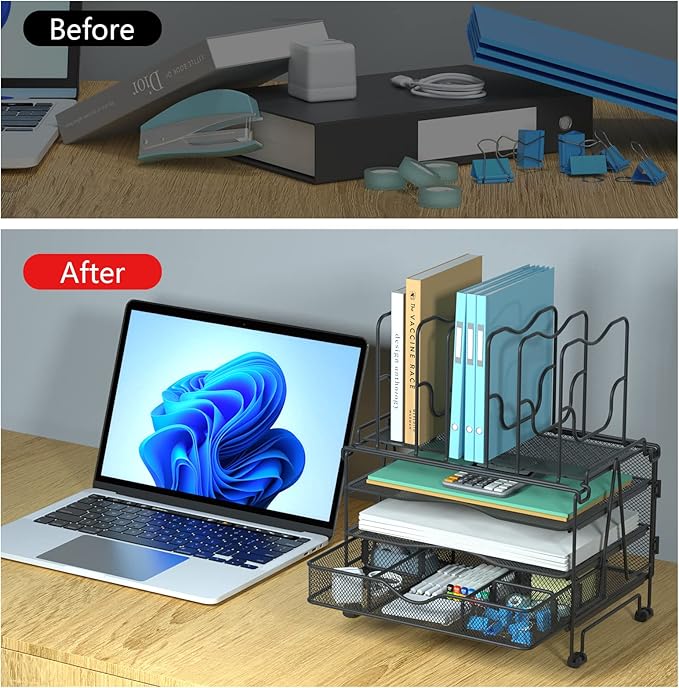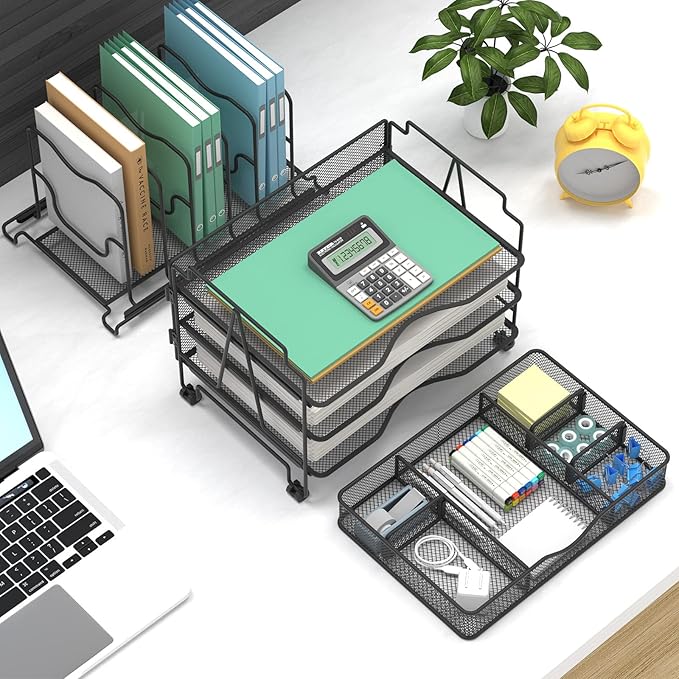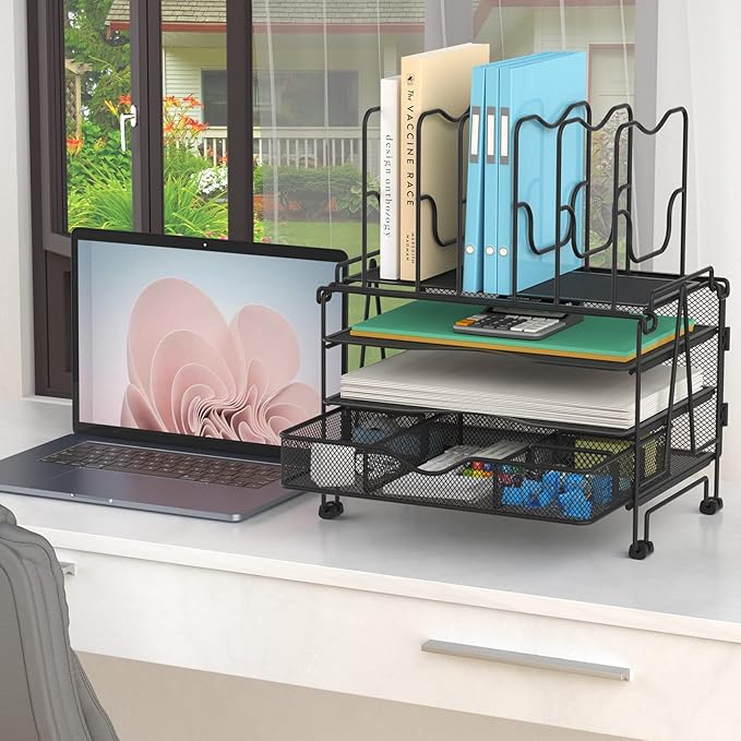 - 【3 IN 1 Multifunctional Combination】Thanks to upgraded designed with three parts--3 tier paper tray, sliding drawer and 5 upright sections, the BOHDK mesh metal desk organizer has larger vertical and horizontal storage space than traditional desk organizers. The 3-tier letter tray is perfect for bills, mails and other essentials. The sliding drawer can hold your pens or other accessories. Also the 5 vertical sections is ideal for organizing binder, document organizer, book organizer and so on.