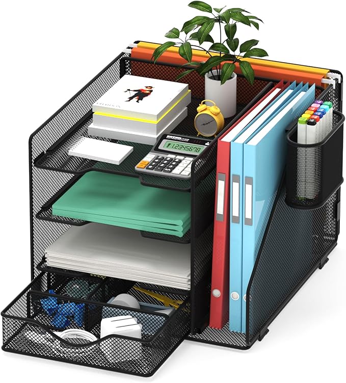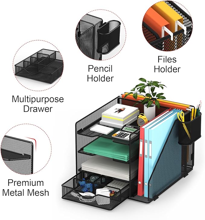 - KEEP YOUR DEAKTOP ORGANIZED: This desk organizer allows you to consolidate three desk organizers into one,keeping your paperwork organized and eliminating clutter. Very handy for organizing small office items and provides the extra storage you needed.