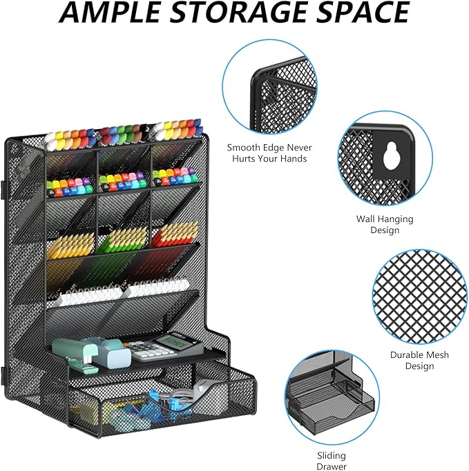 BOHDK Pen Organizer for Desk, Multi-Functional Desk Organizer, Wall Mount Pen Holder with Drawer for School, Office, Home, Art Supplies, Black